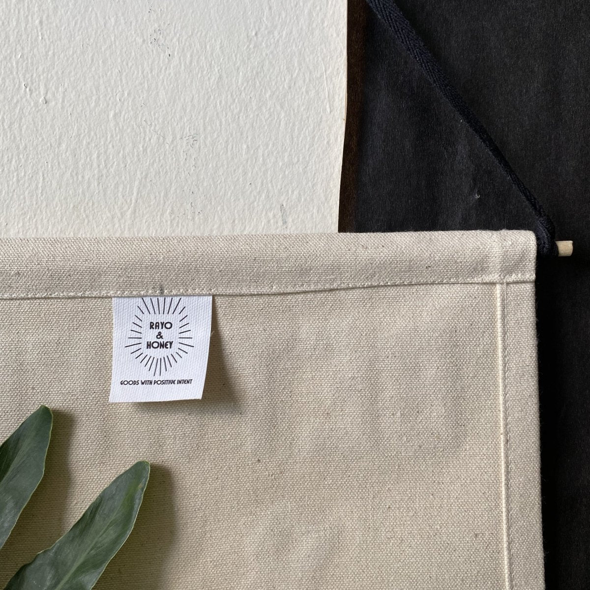- hang string is cotton black bias tape with hand knotted loops on a hard wood hang stick.